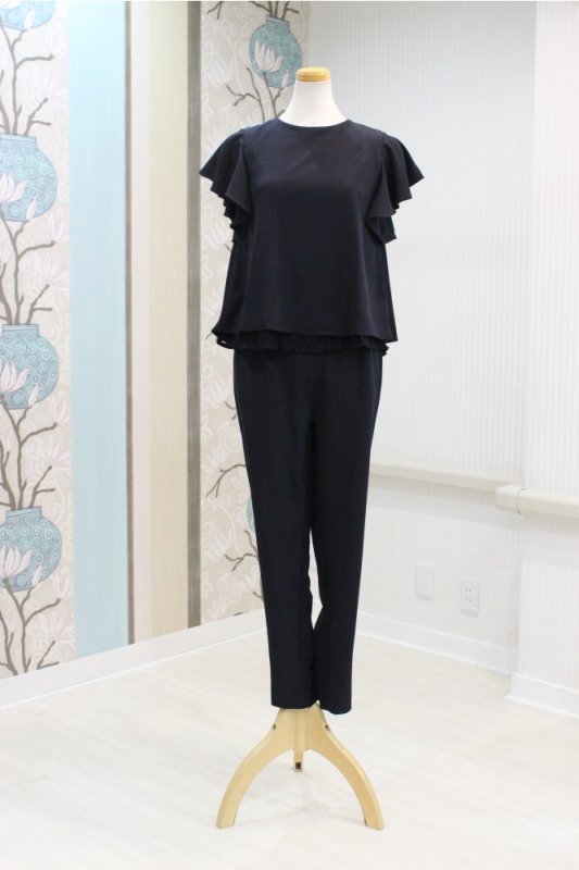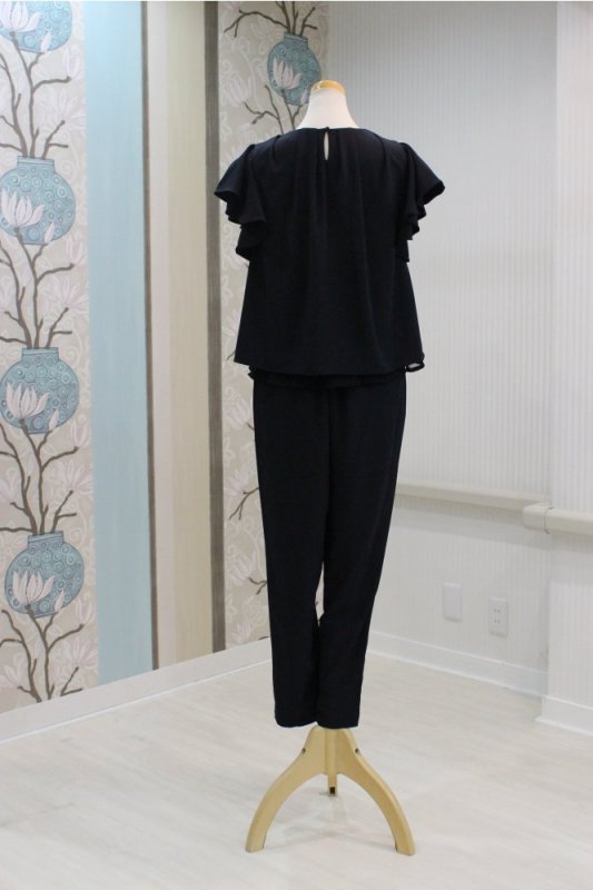フリルの袖がフェミニン感を高めてくれる、女性らしいシルエットのセットアップパンツドレスです。
